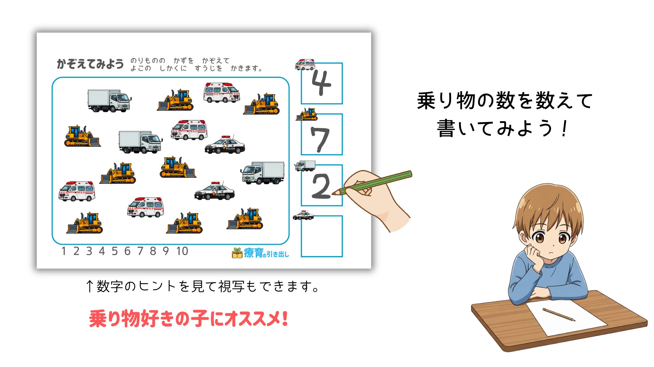 • 乗り物を数えて数字を書いてみましょう。