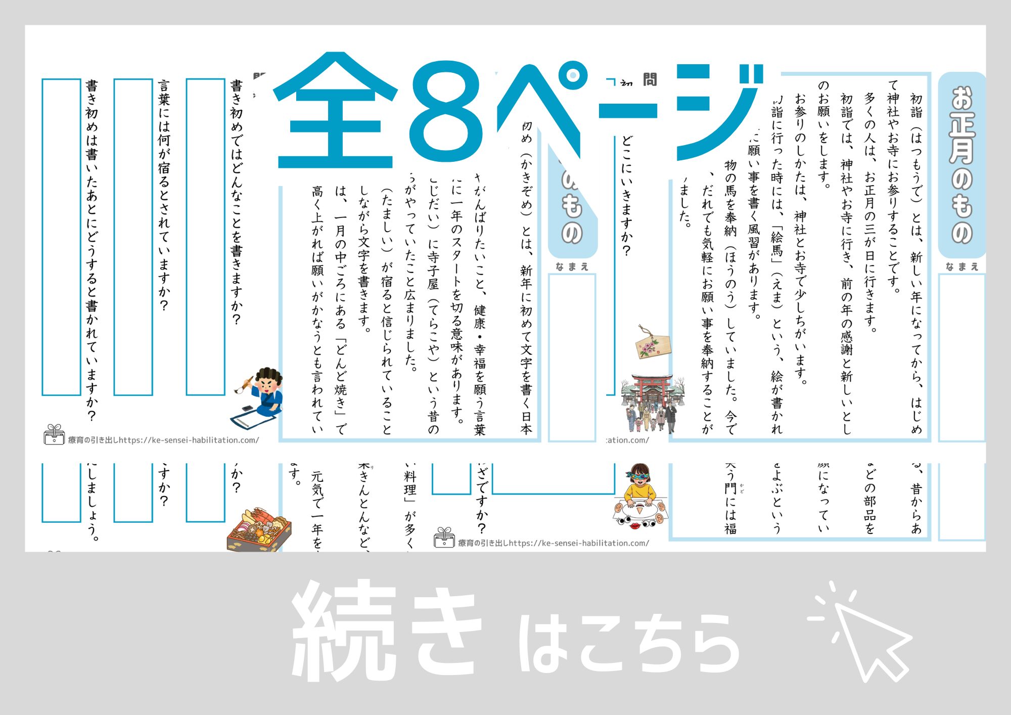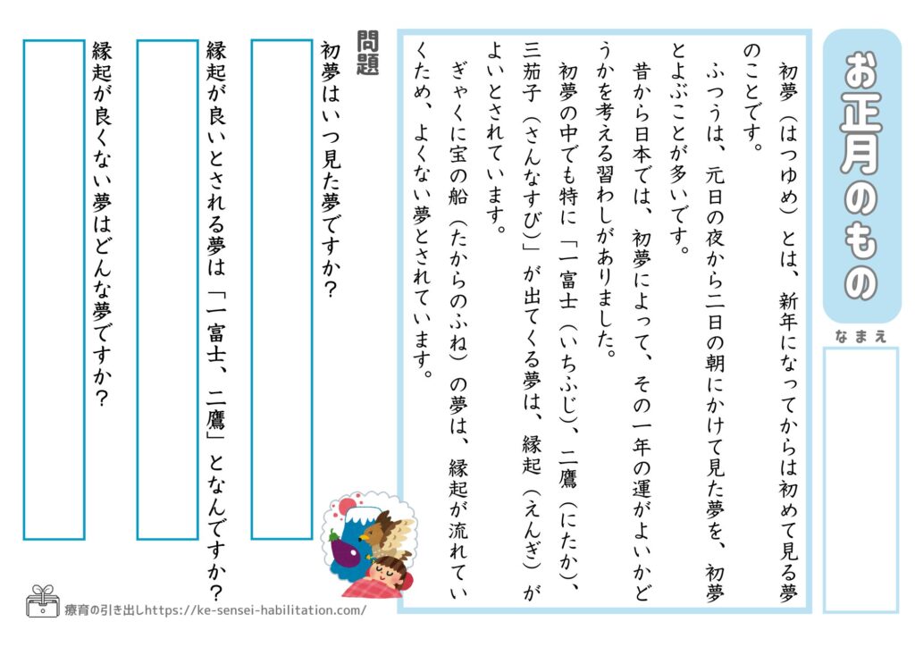 説明文をベースとした文章読解のプリントです。お正月に関するものがテーマになっています。季節感をかんじながら文章を読む機会となれば嬉しいです。
