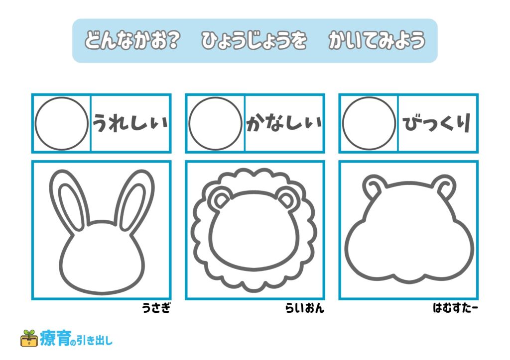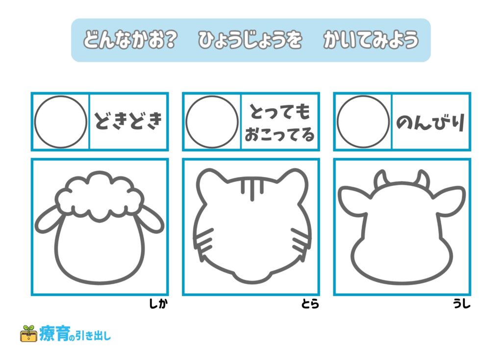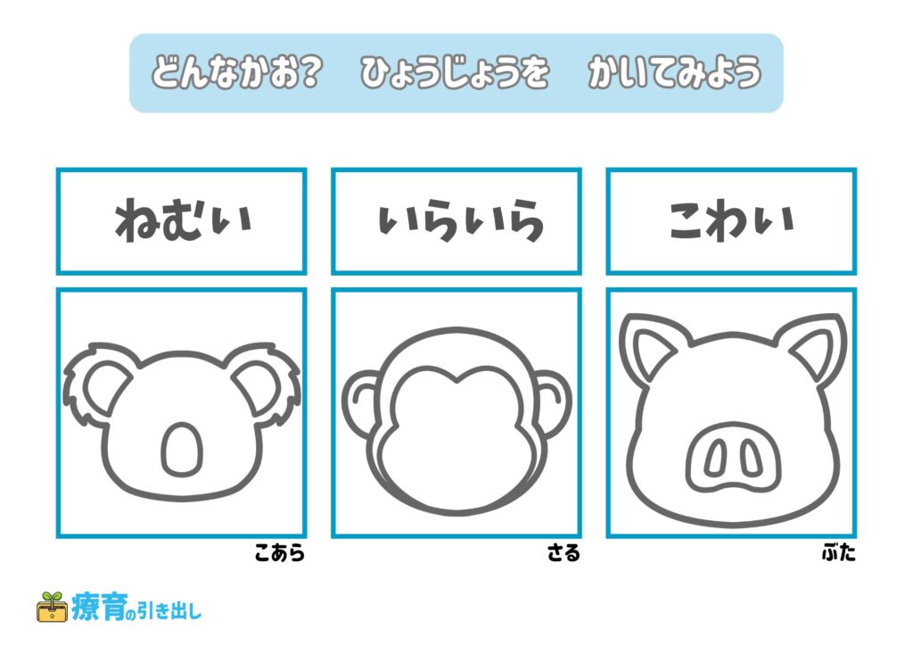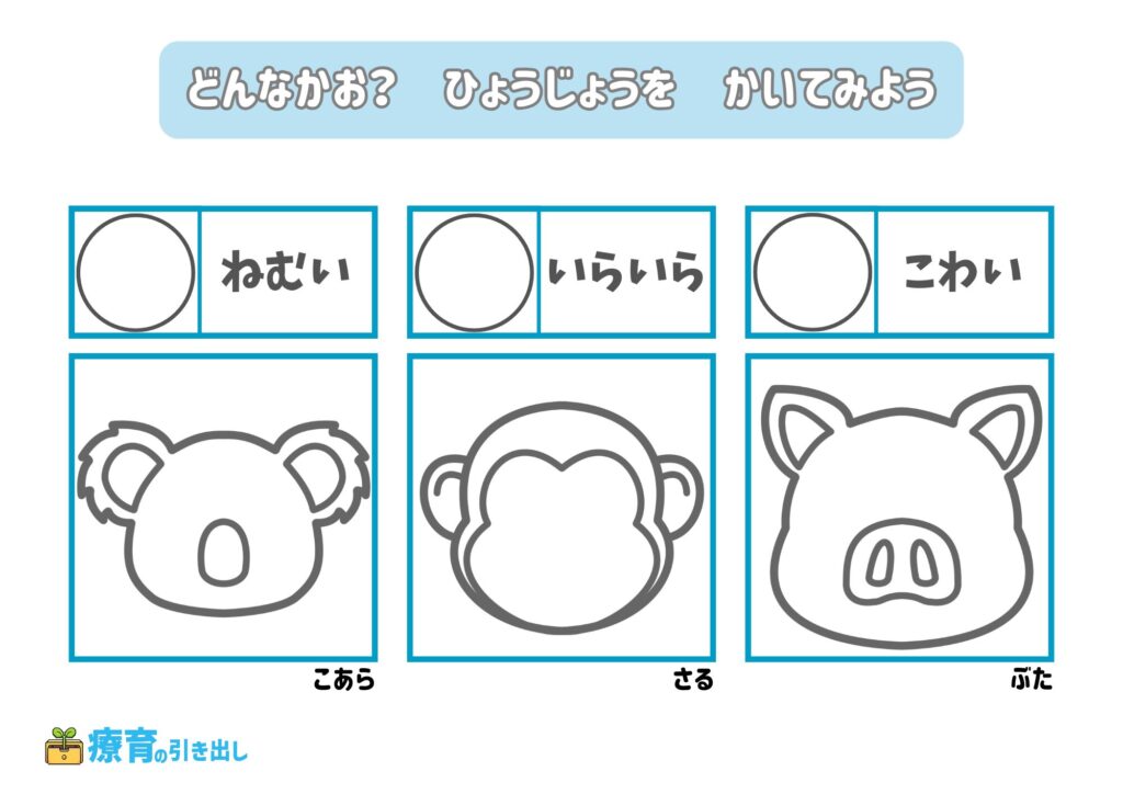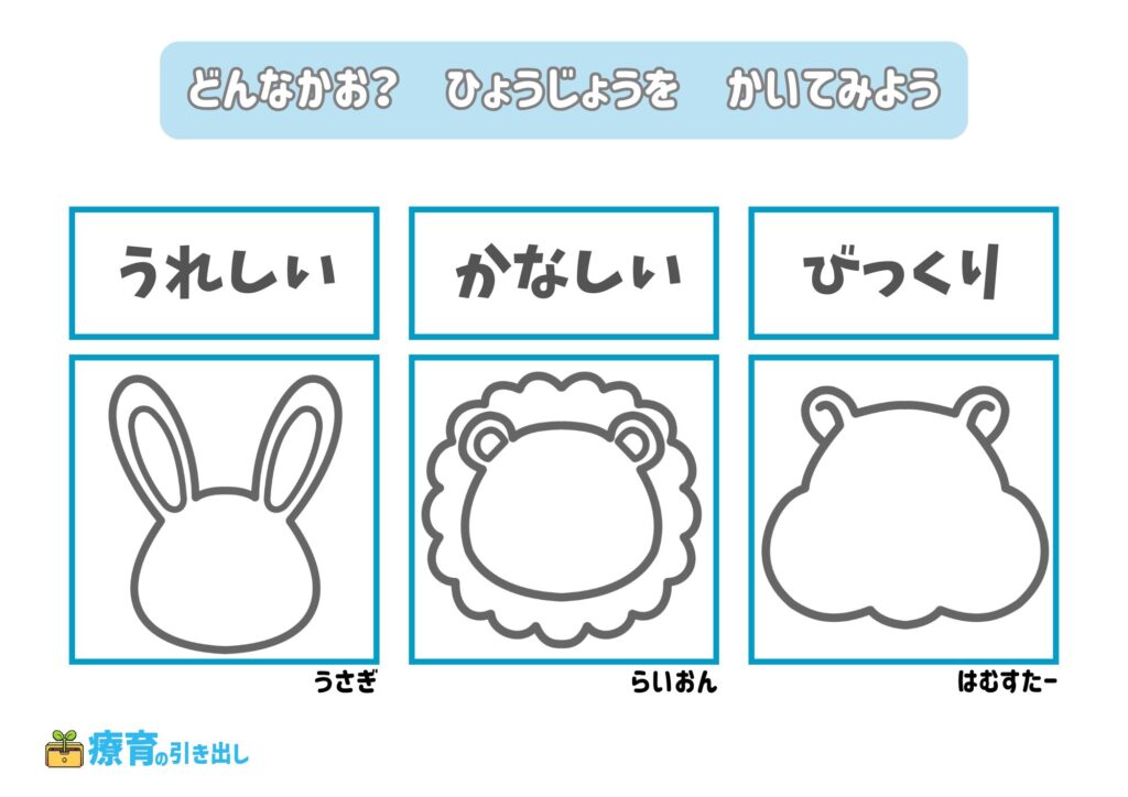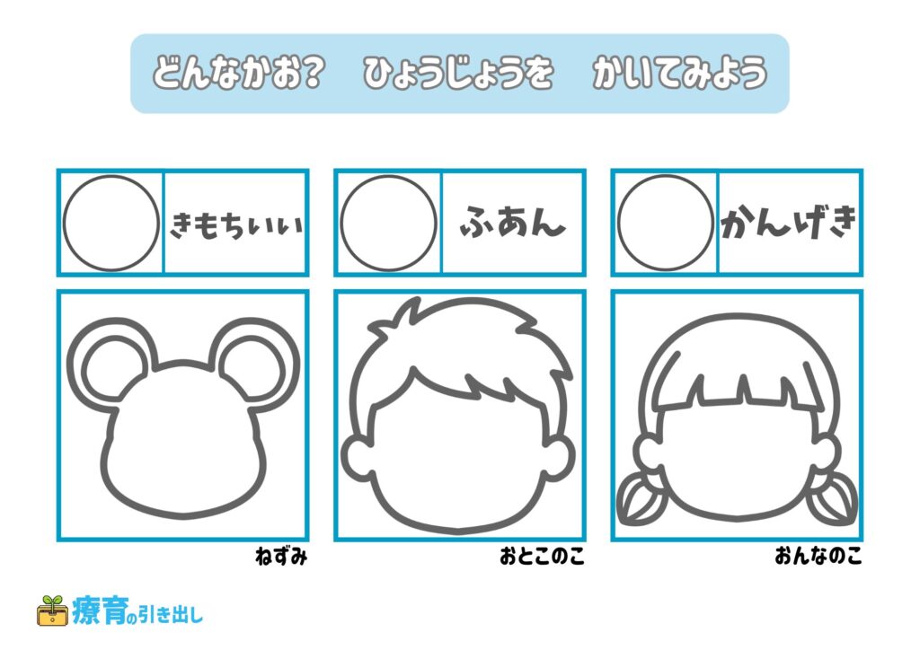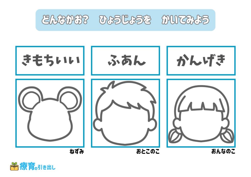 • 指定された気持ちの表情を描いてみましょう。