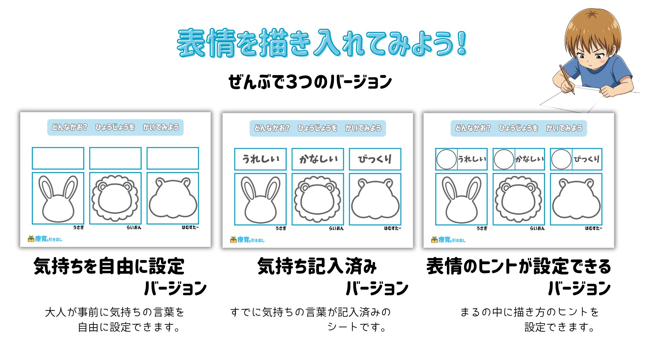 • 表情を事前に大人が書くバージョンとヒントの書き入れバージョンを使用する場合には事前準備をしっかりしておきましょう。