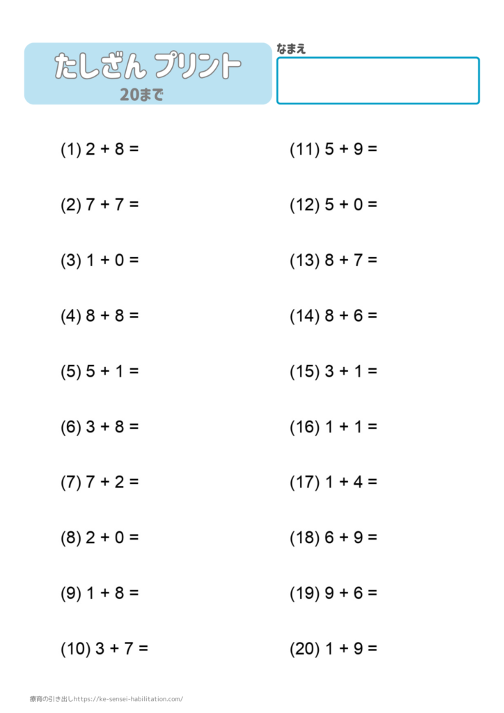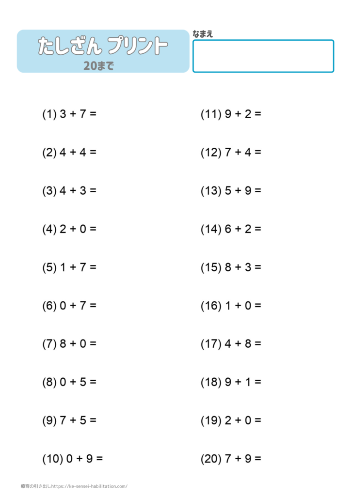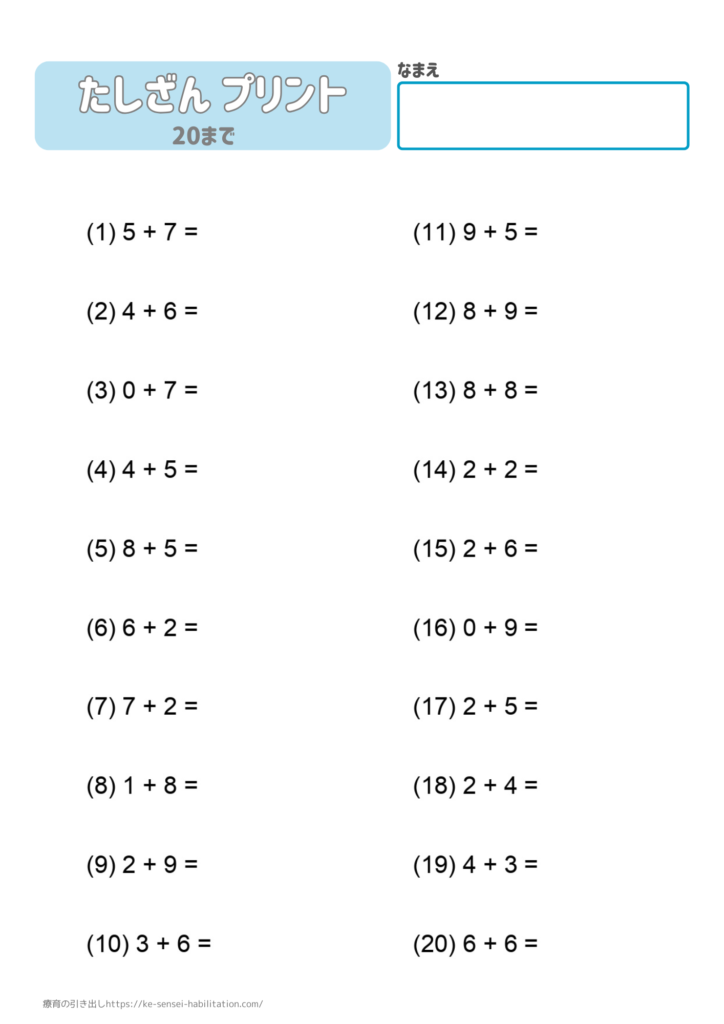 【足し算】 20まで 繰り上がりあり ランダム問題 12枚