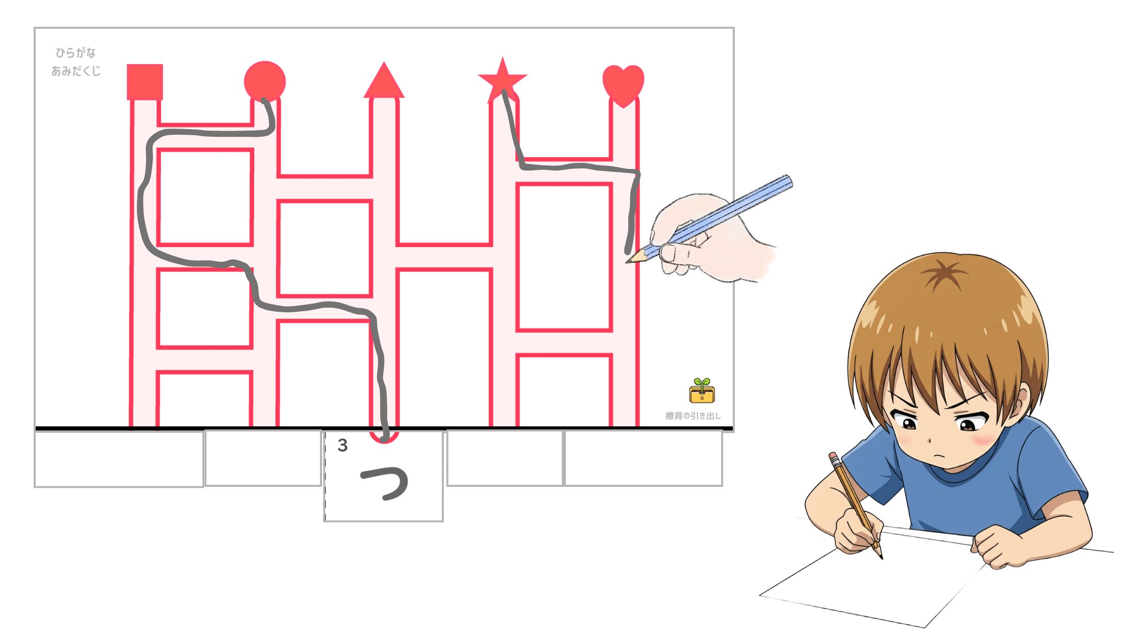 あみだくじは注意を最後まで維持する必要があり、集中力や注意力の維持の練習にもなります。利き手によっては曲がり角が手に隠れて見えなくなることもあるので、先に指でなぞる工程などが必要かもしれません。