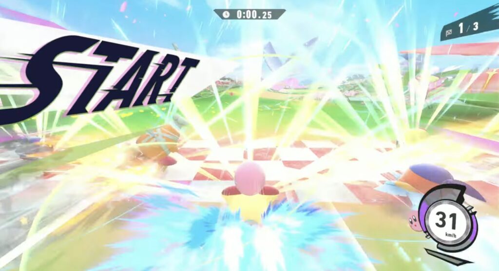 カービィたちが空を飛ぶマシン(エアライドマシン)に乗って、スピードやアイテムを使いながら競争するアクションレースゲームです。