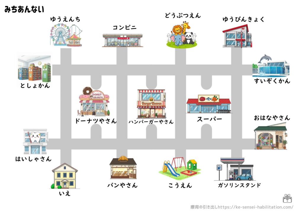 誰から見て右に曲がるのか。など客観的視点や視点の切り替えに困難感があると難しい課題になります。なので、難易度を下げる時には右に曲がるなどの言葉は使わずに建物名だけで指示をすると良いかもしれません。逆に難易度を上げたいい場合には建物名を言わずに実施すると良いです。