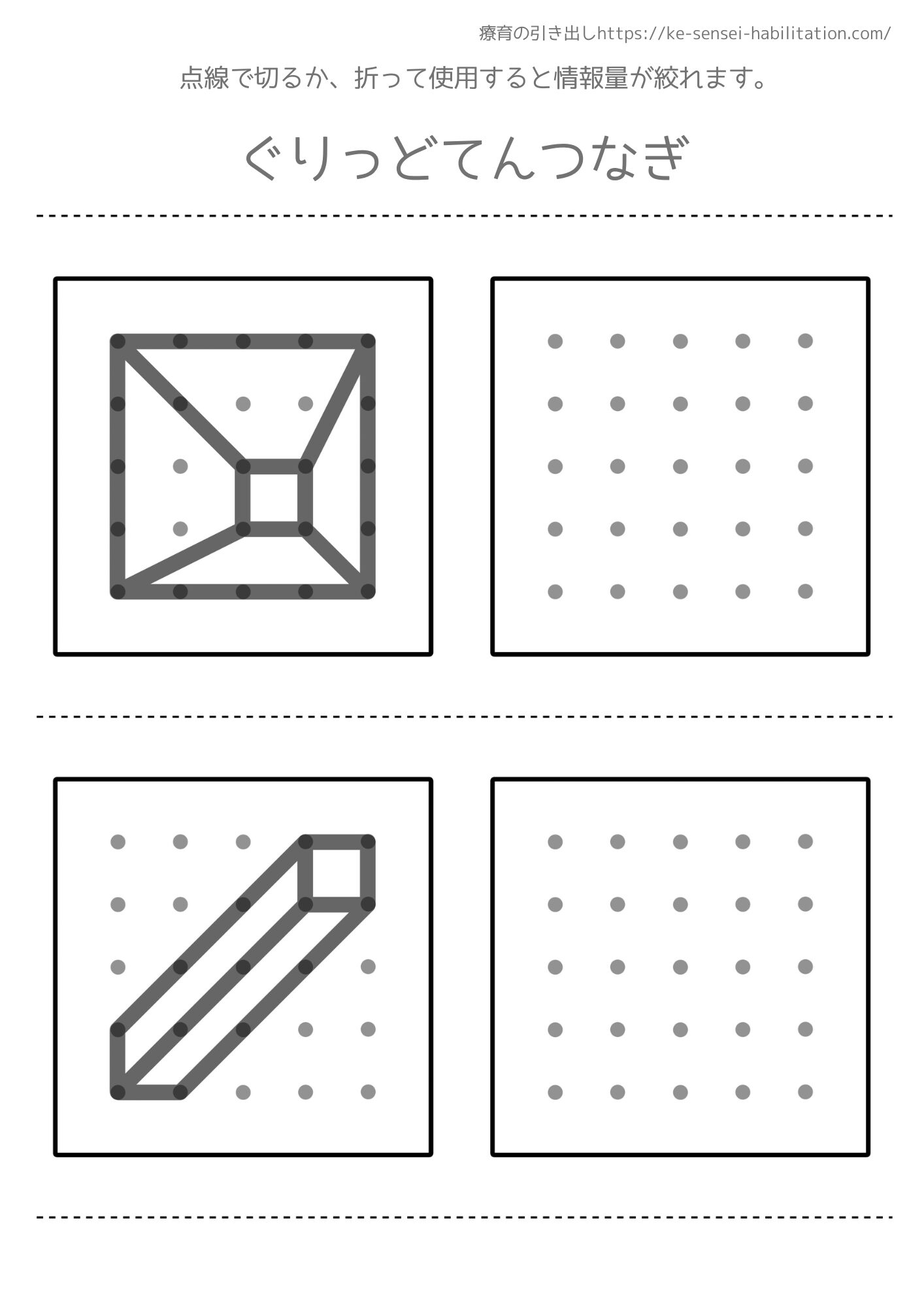 グリッド点つなぎを横長にしたバージョンです。正方形との違いは横に長いという点と、点の配列が1列ごとに半分ずれている点です。この微妙な斜め加減が結構難易度をあげているんじゃないかと思います。