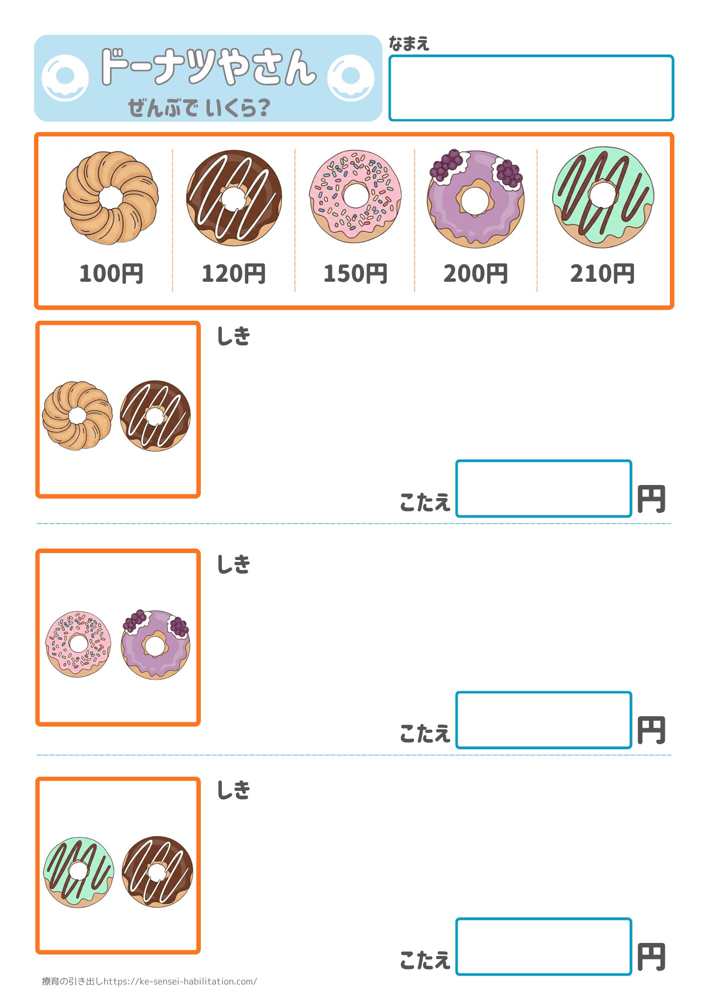 問題はご自身で作成することをお勧めします。全てのお子さんに合わせた難易度設定をすることは不可能なので問題あり版は参考程度に見てもらえればなと思います。印刷の設定によっては青が黒っぽく写ってしまうかもしれません。